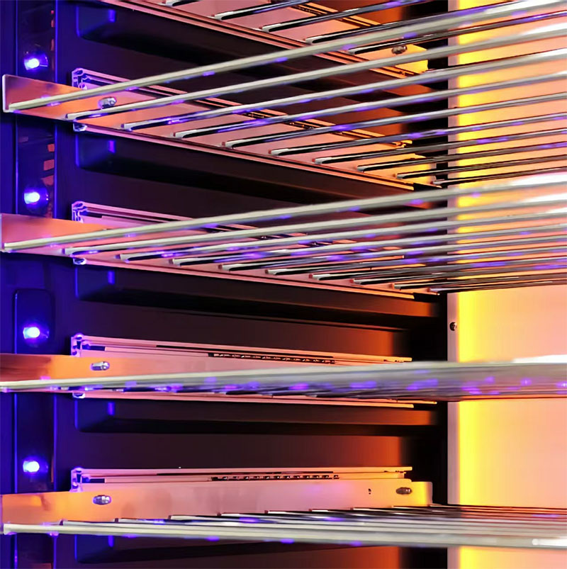 Top rack and bottom storage compartment can fit larger style bottles like Champagne and Magnum